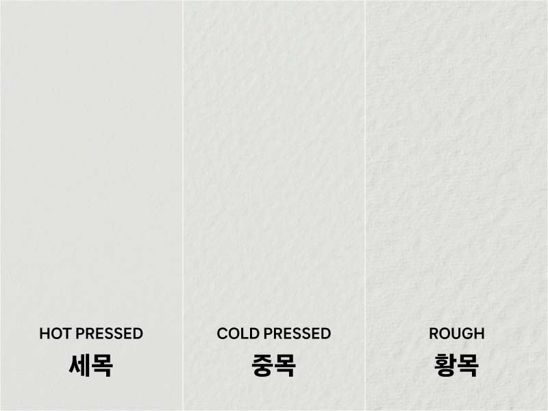 - 세목 (HOT PRESSED) : 고운 압착 방식으로 표면이 매우 매끈하여 세밀한 묘사에 유리합니다. 다만, 초보자에게는 물 조절이 어렵게 느껴질 수 있습니다.