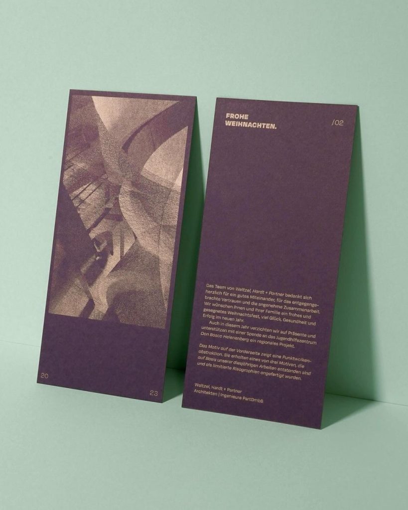 이 사례는 새해 소망을 담아 부동산 업계 고객을 위해 특별히 발송된 연하장입니다. 더블 코팅 처리된 보드지인 ‘심볼카드에코’를 사용했으며, 강도가 좋고 평량이 두꺼워 태그(택), 카드, 엽서 제작 등에 주로 사용됩니다. 해당 제작물에는 독일어로 ‘기억에 남는 한 해’라는 문구가 작성되어 있어 메시지의 의미를 더합니다.